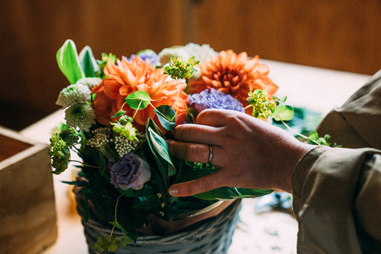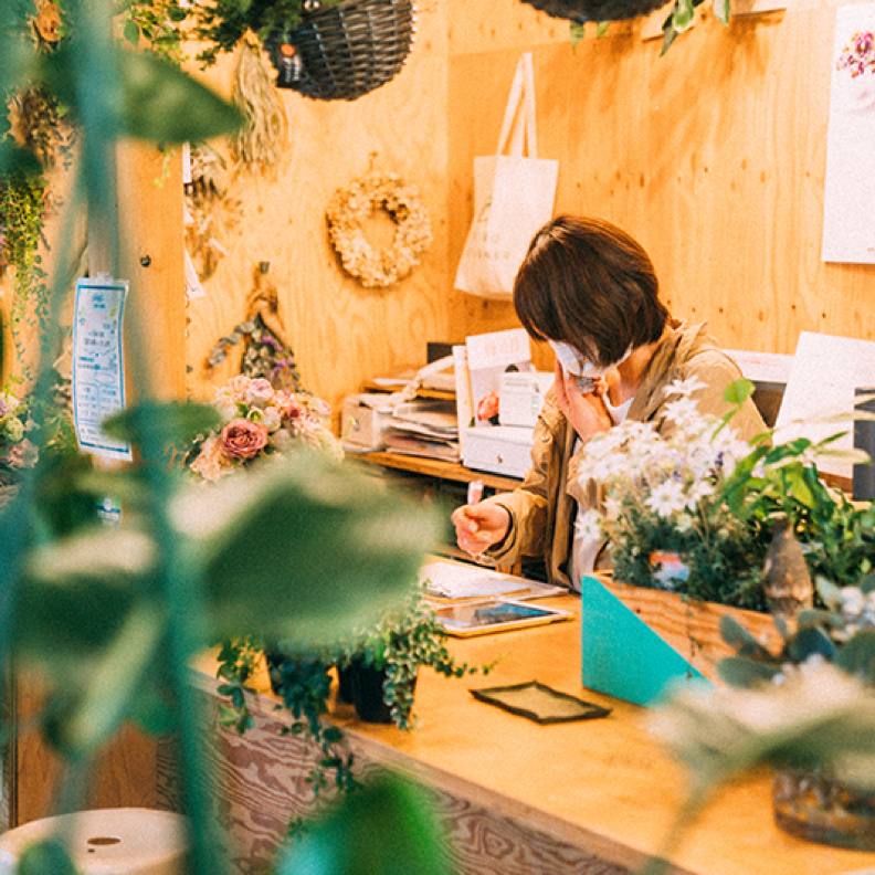 フラワーアレンジメントは、お客さんがそばで見てる時は15分くらいで仕上げるけど本当は30分はかけたい。こだわりたい部分もあるし。